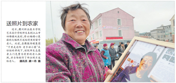 近日,衢州职业技术学院艺术设计学院师生来到江山市四都镇双溪村,将45幅精心装裱的大幅照片送给村里的留守老人。此前,在衢报传媒集团“千里走边际 老乡话小康”采访组的牵线下,该院师生志愿者上门免费为村里的老人拍照,并当场制作了部分照片送给老人。