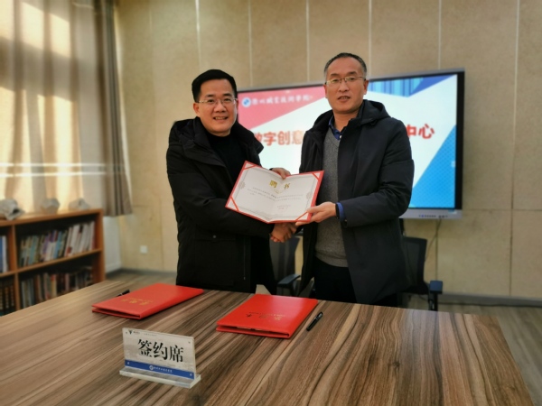 副校长何百通为李新祥教授颁发数字创意设计产业创新中心主任聘书,并与浙江灵动广告有限公司总经理孙操、衢州市嘉易文化传媒有限公司总经理马惠兵签订校企合作协议书。