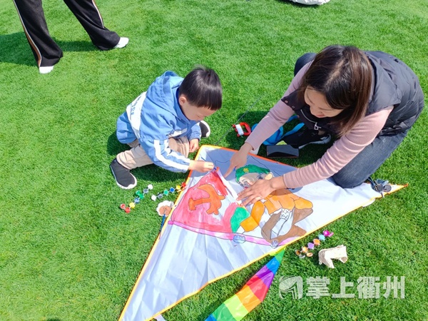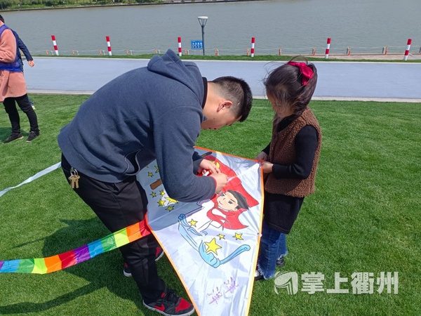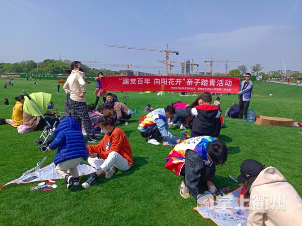 4月10日上午,一大群孩子在家长和志愿者的带领下来到西区大草原,有的围着家长听讲红军长征故事,有的在志愿者指导下为风筝题画。风筝上的画都是红色革命故题材,有嘉兴南湖上的红船,有浴血奋战的红军战士,有党旗下庄严宣誓的年轻党员……这群孩子和家长全部来自白云街道阳光社区,而志愿者是衢州职业技术学院艺术学院的党员志愿者们。