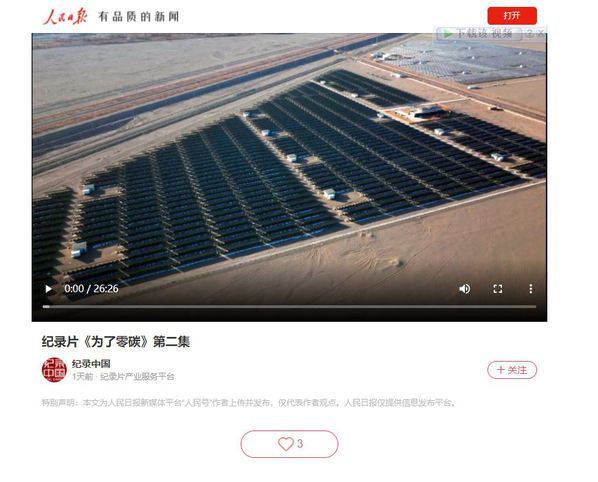 纪录片《为了零碳》在《人民日报》客户端首发,随后人民网、新华网、央视频、学习强国等央媒纷纷发布。