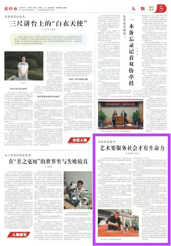2026年1月6日《团结报》刊登了民进衢州职业技术学院支部主委、衢州职业技术学院艺术设计学院副院长潘宇用艺术服务社会的故事。