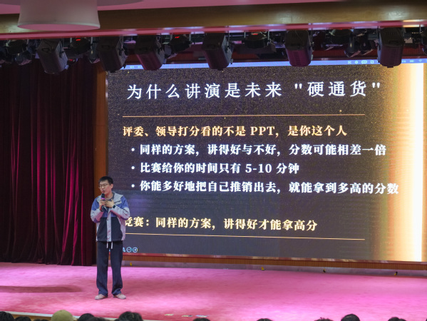 随后,龚一舟老师以 “如何提升大学生演讲能力” 为主题展开分享。他结合 “张雪机车” 团队坚守初心、突破技术垄断的励志案例,从 “热爱赋予表达温度”“坚持筑牢表达底气” 两个维度,引发学生共鸣。同时,龚老师分享了自身从 “舞台恐惧” 到 “从容演讲” 的成长经历,用诙谐幽默的语言拆解演讲误区,围绕 “克服紧张情绪”“搭建清晰逻辑”“强化情感传递” 三大核心,传授了很多切实可行的训练方法,内容兼具指导性与趣味性。