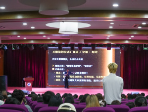 随后,龚一舟老师以 “如何提升大学生演讲能力” 为主题展开分享。他结合 “张雪机车” 团队坚守初心、突破技术垄断的励志案例,从 “热爱赋予表达温度”“坚持筑牢表达底气” 两个维度,引发学生共鸣。同时,龚老师分享了自身从 “舞台恐惧” 到 “从容演讲” 的成长经历,用诙谐幽默的语言拆解演讲误区,围绕 “克服紧张情绪”“搭建清晰逻辑”“强化情感传递” 三大核心,传授了很多切实可行的训练方法,内容兼具指导性与趣味性。