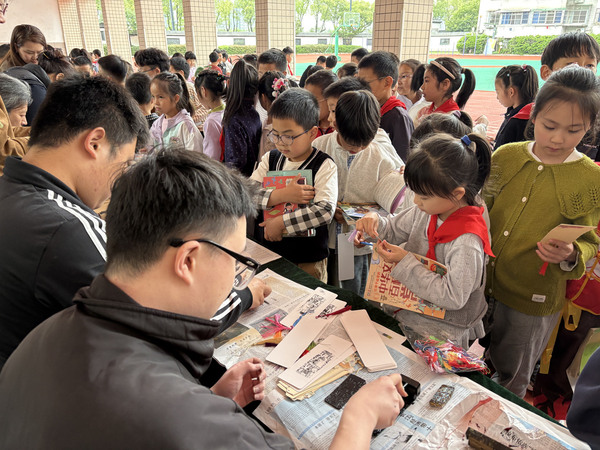 4月23日世界读书日当天,府山街道坊门街社区、天皇巷社区联合新华小学、衢州职业技术学院及盛世文化校企创意工坊,在新华小学校园内开展“以书换shu·书香互传”全民阅读主题活动。活动按年级错峰进行,现场设置三大专区,将阅读推广与非遗传承融为一体。